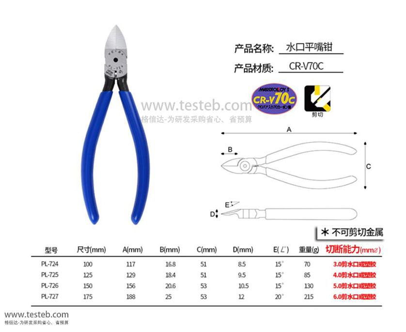 | PL-726水口鉗 | 4mm剪水口或塑膠 | 20.5 | 10.5 | 15° | 156mm(6寸) | 130g |
