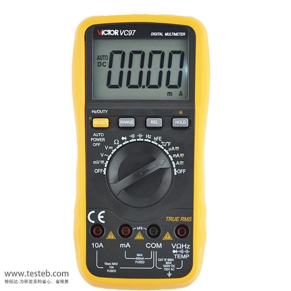 勝利VC97數(shù)字萬(wàn)用表是一種性能穩(wěn)定可靠的數(shù)字萬(wàn)用表,具有3 3/4位讀數(shù),真有效值功能,可用來測(cè)量直流電壓、交流電壓、交直流電流、電阻、電容、頻率、占空比、二三極管及通斷測(cè)試,金屬屏蔽板,防磁抗干擾能力強(qiáng),流線型設(shè)計(jì),手感舒適。
